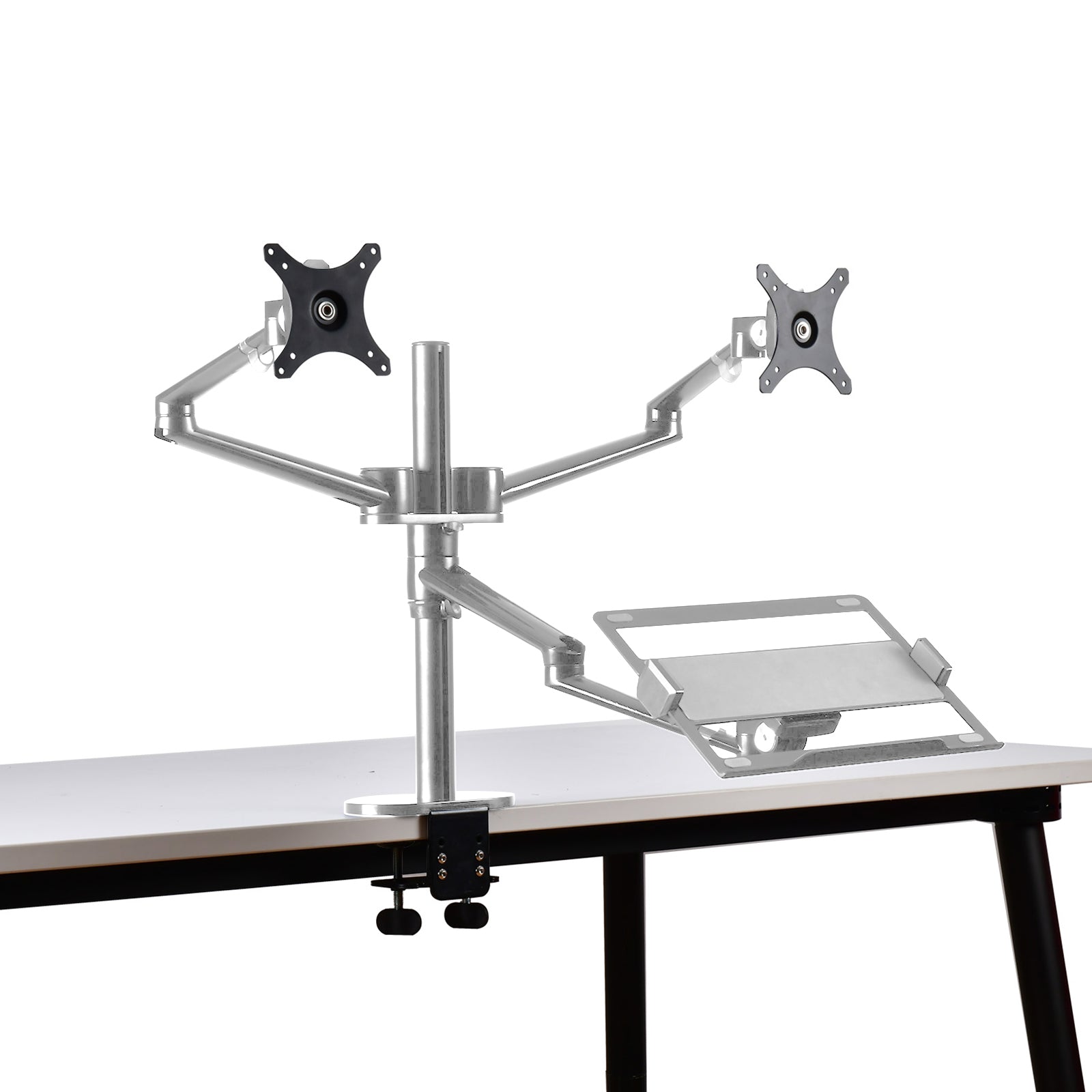 - Compatibility: Universal Mount Fits monitor up to 27”, Ergonomic full motion laptop holder fits up to 17” notebook. Maximum support weight up to 20lbs per arm. Mount plates detachable and height adjustable compatible with VESA mounting hole 75x75mm and 100x100mm. Drill-free clamp fits most desks up to 3” thick.
