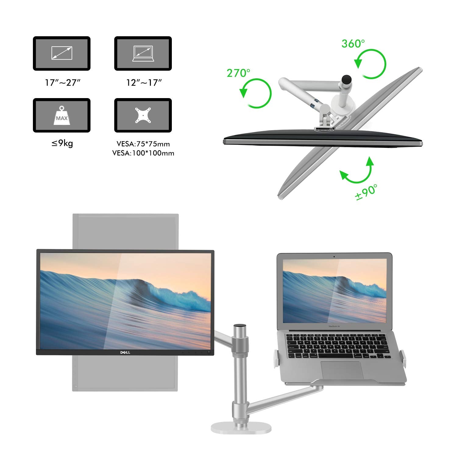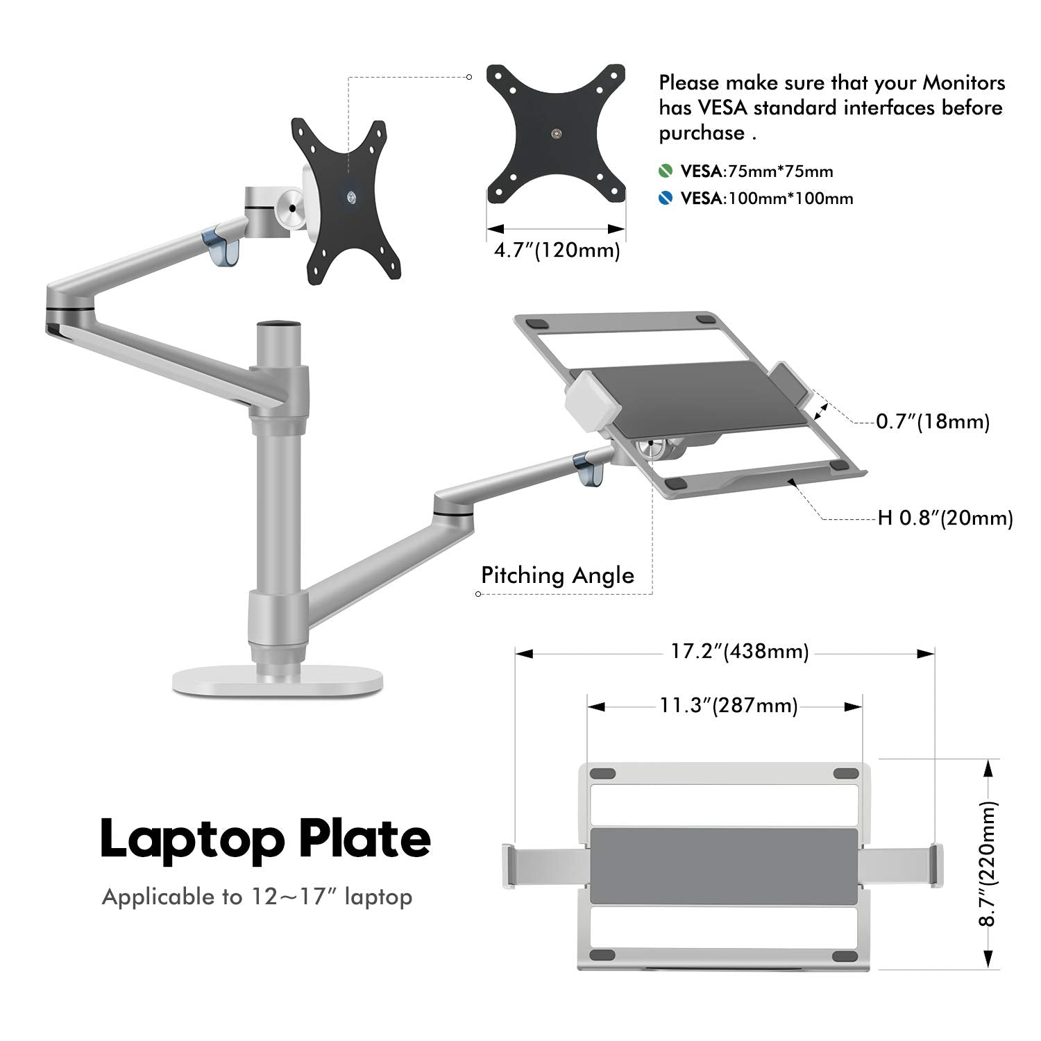 - Compatibility: Universal Mount Fits monitor up to 27”, Ergonomic full motion laptop holder fits up to 17” notebook. Maximum support weight up to 20lbs per arm. Mount plates detachable and height adjustable compatible with VESA mounting hole 75x75mm and 100x100mm. Drill-free clamp fits most desks up to 3” thick.