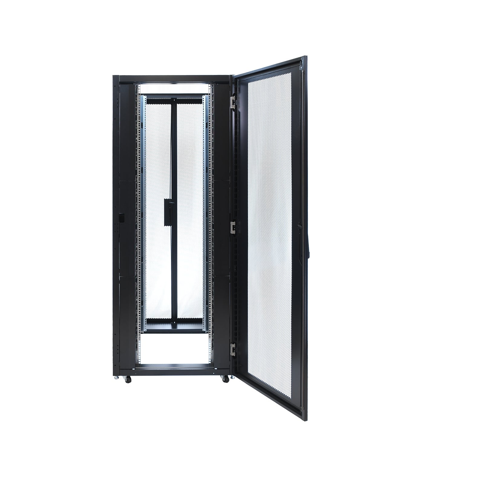 Ventilated front and rear doors: Both front and rear doors feature ample perforations up to 78% to allow for optimal ventilation to keep your equipment cool. Split rear doors for better clearance and easy layout.