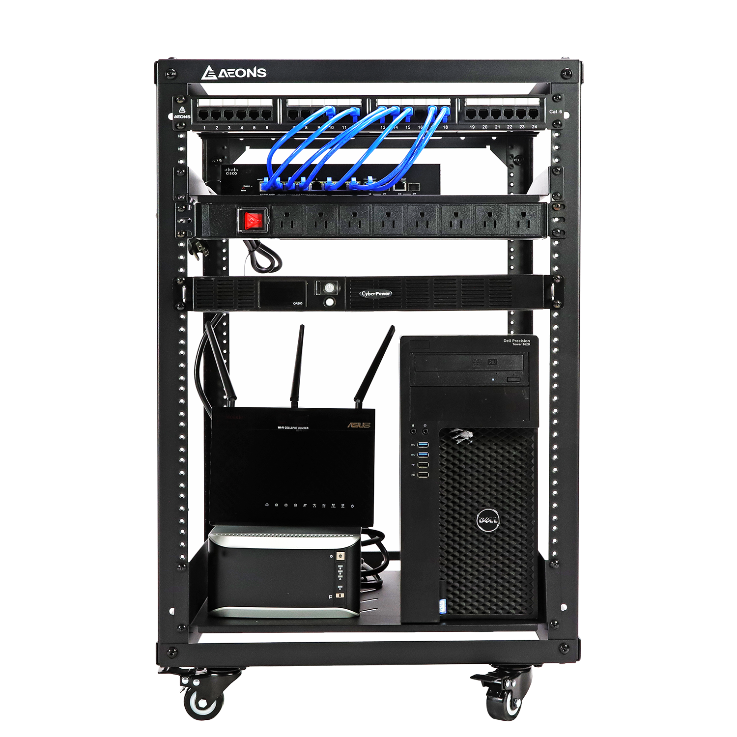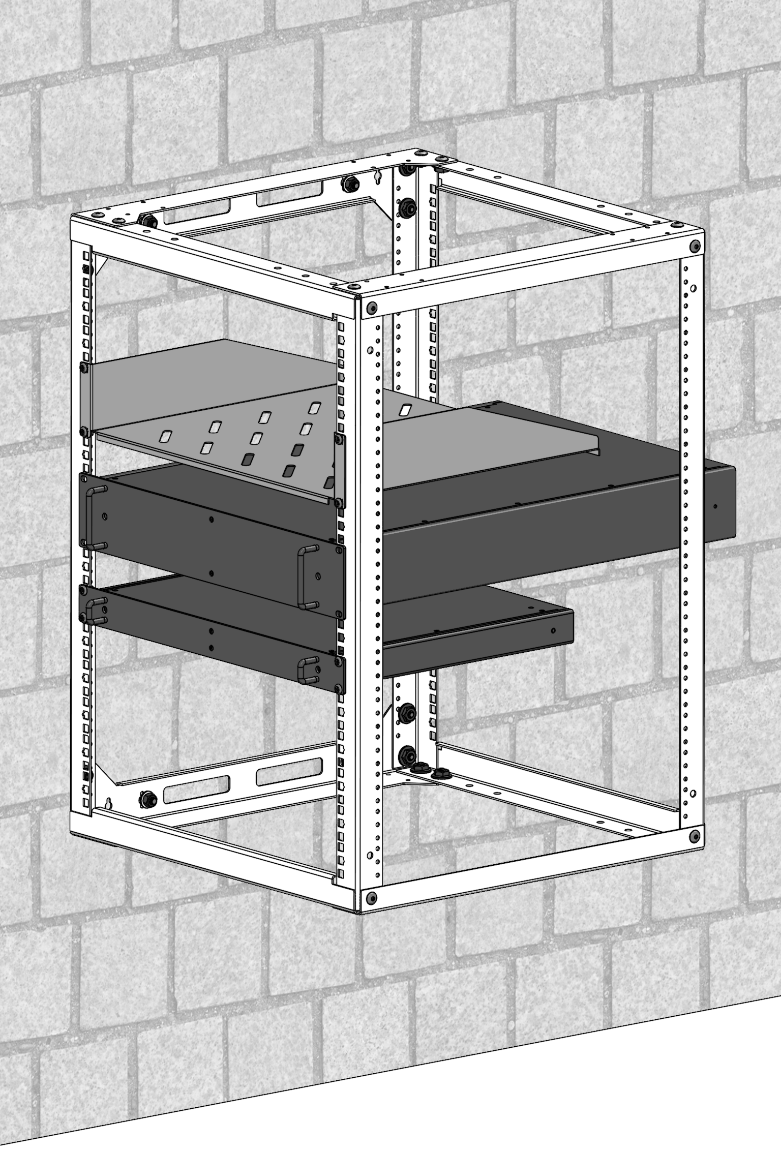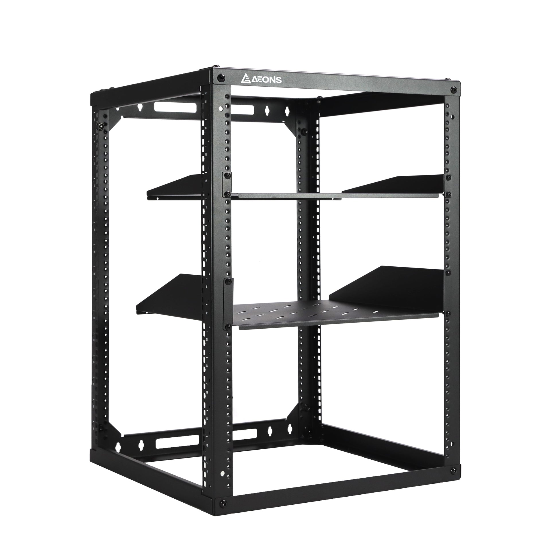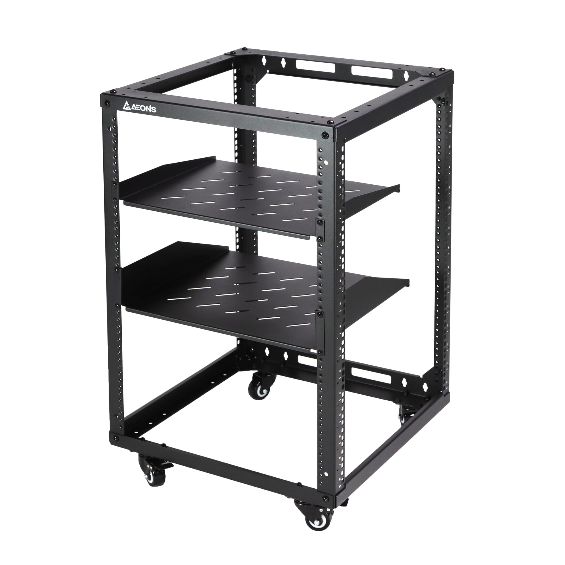 - Includes everything you need to rack 'em up! Entire 15U open frame rack structure, 1x 1U vented shelf (14" deep), 1x 2U vented shelf (16" deep), and rack mounting screws.