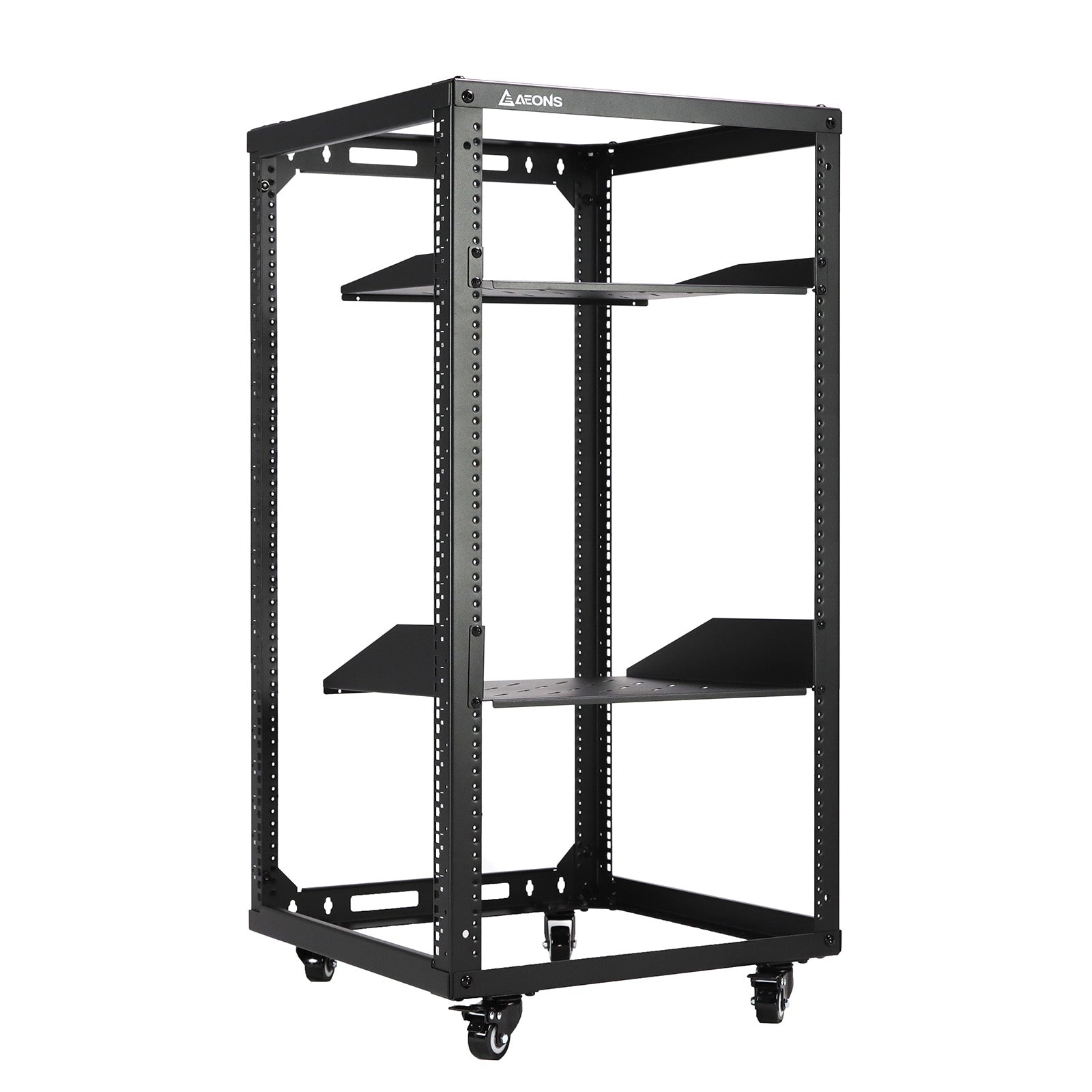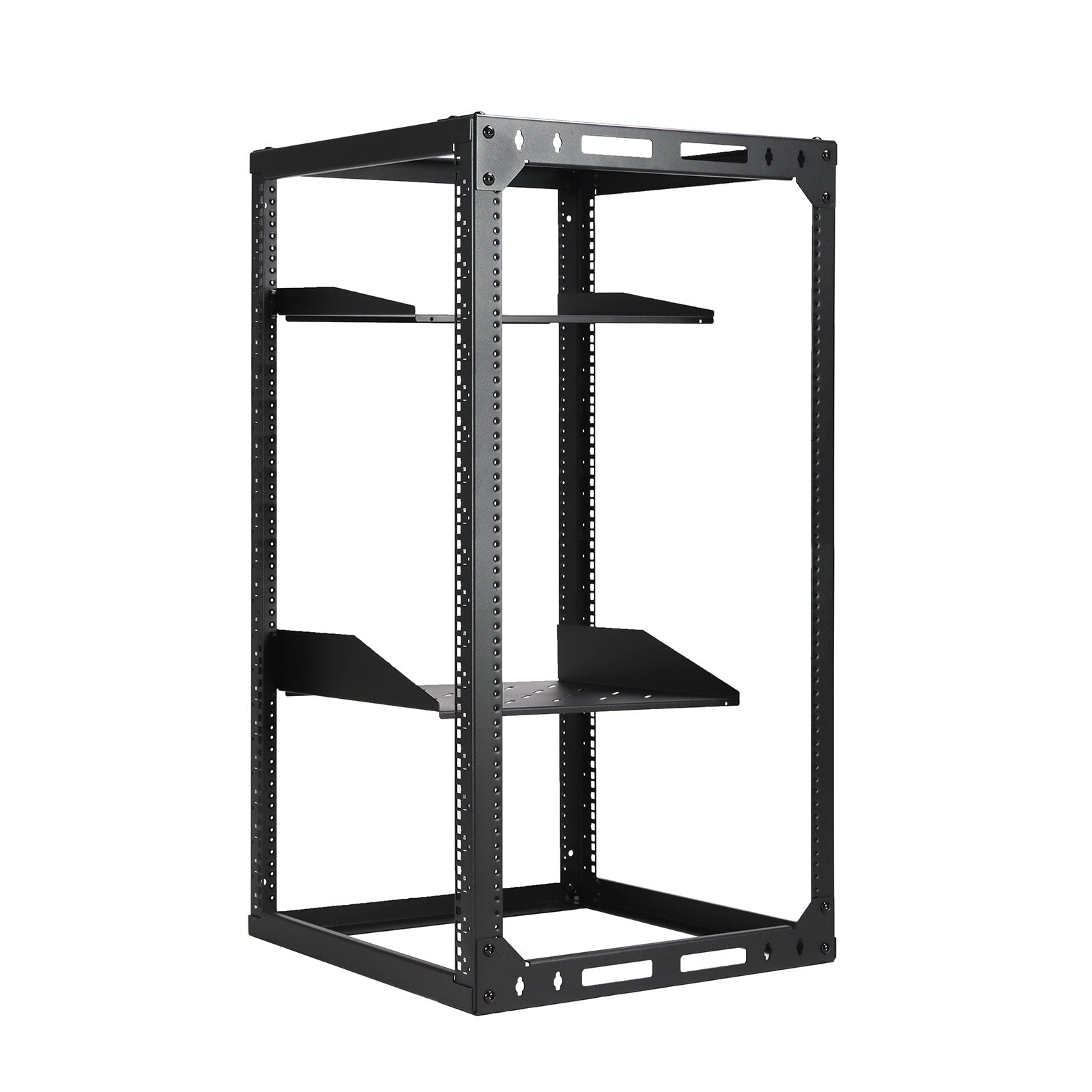 - Includes everything you need to rack 'em up! Entire 20U open frame rack structure, 1x 1U vented shelf (14" deep), 1x 2U vented shelf (16" deep), and rack mounting screws.