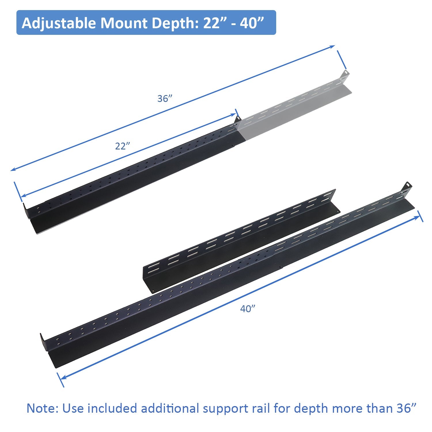 Adjustable mounting depth for variety of rack depth configurations. They occupy 1 RU of rack space, continuously adjustable mounting depth from 20 - 33.5 inch. Mounting screw kit is included.