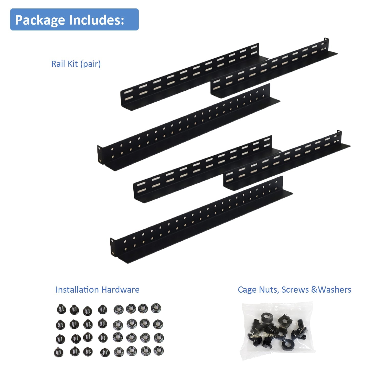 - Package includes: 1 set of 1U Adjustable Depth Rails, Mounting screw kit.