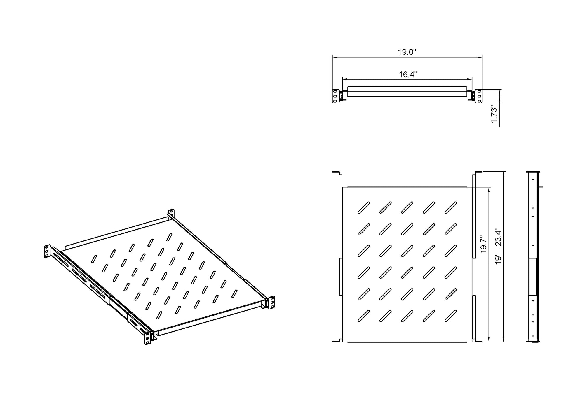 - Versatility: Adjustable mounting depth of 19 – 23.5 in provides flexibility to fit various installation of rack and cabinets. Rack shelf is 20" deep and extends 12.75".