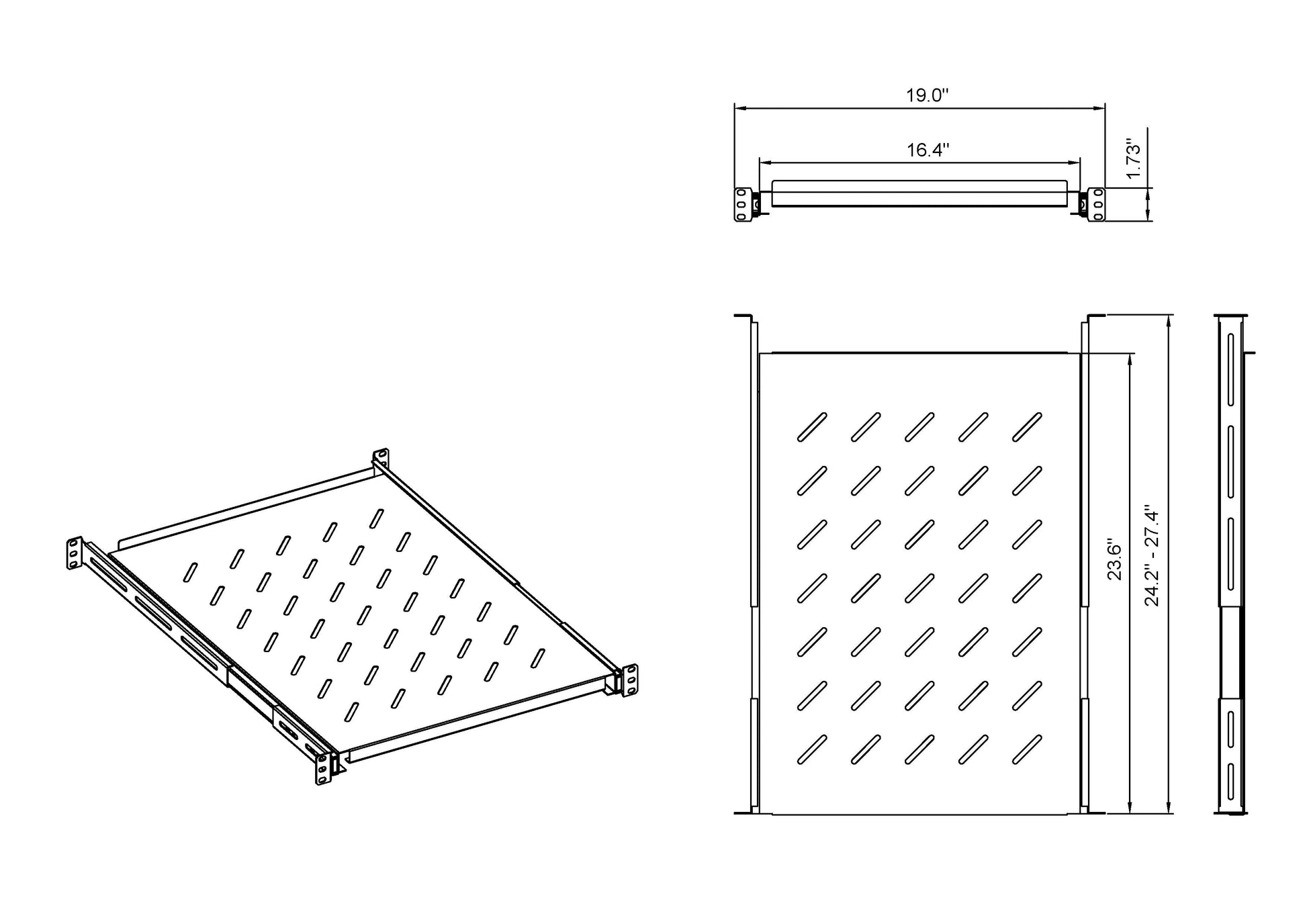 - Versatility: Adjustable mounting depth of 24.2 – 27.5 in provides flexibility to fit various installation of rack and cabinets. Rack shelf is 24" deep and extends 12.75".