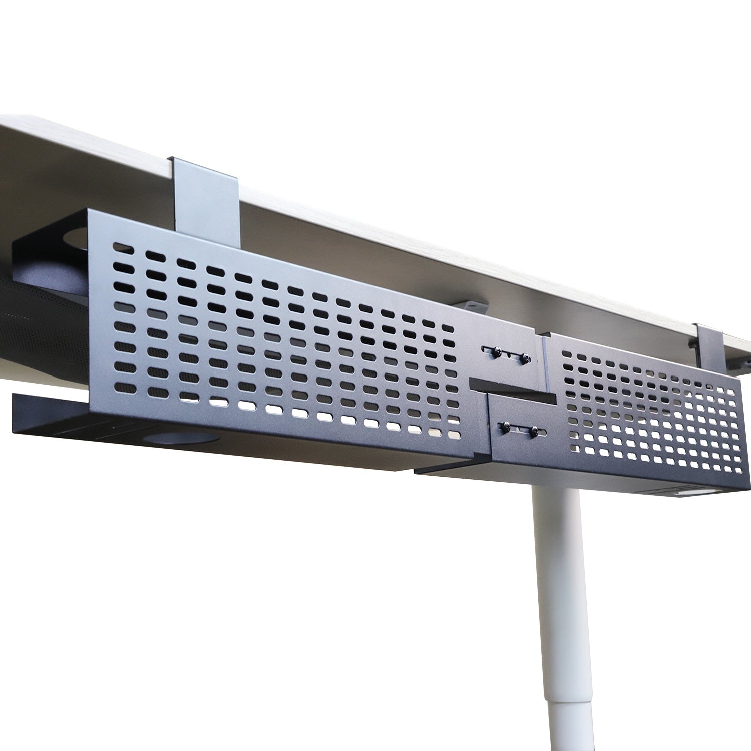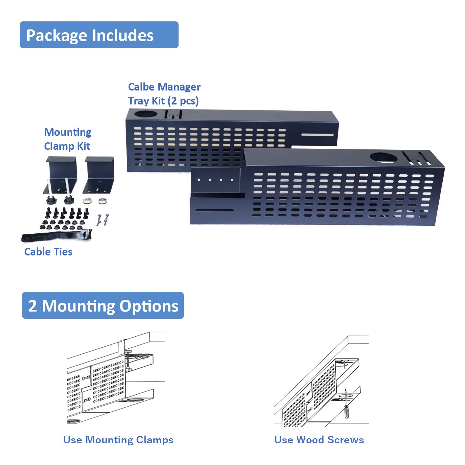 - Easy to Use: Under-desk cable management tray with mounting clamp to secure it to the table (no drilling required, clamp up to 2.1” tabletop); Also available for direct attachment by screws under most wood or wood-composite desks.